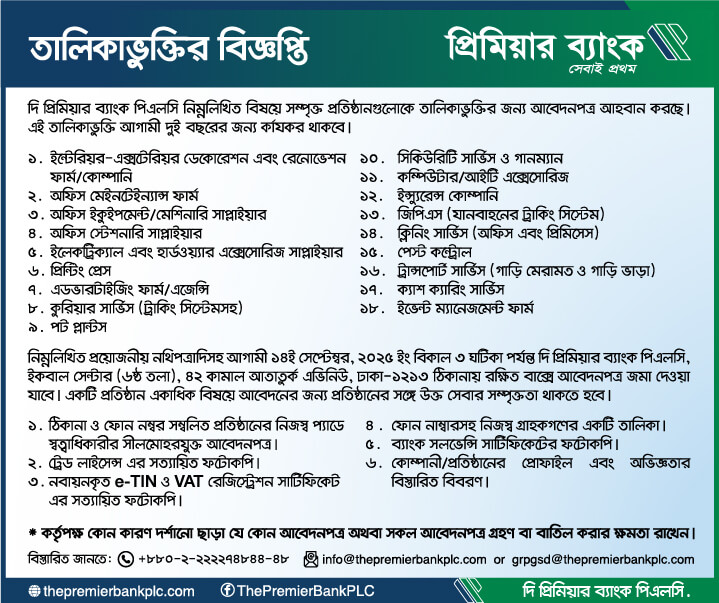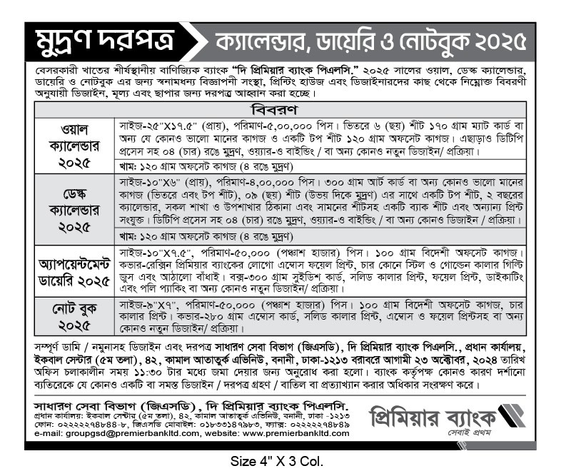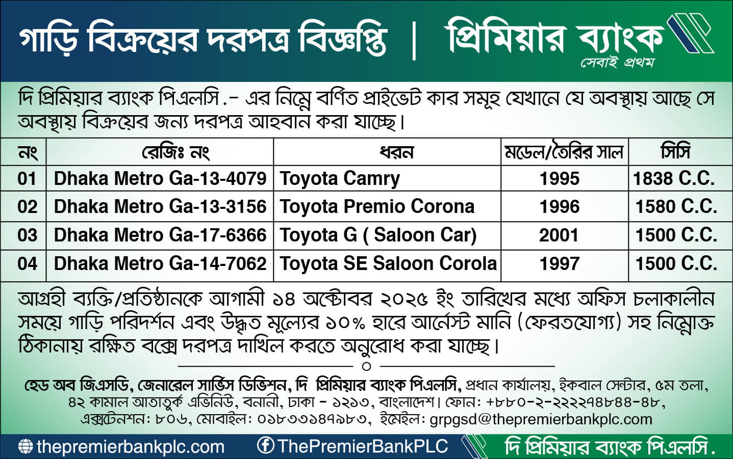 Click to download the Car Sale Tender Notice of The Premier Bank PLC.